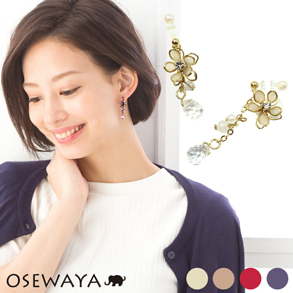 【送料無料】イヤリング 天然石ビーズフラワー樹脂ノンホールオメガクリップイヤリング 日本製 | アクセサリー レディース 女性 大人 プレゼント ギフト 結婚式 誕生日 おしゃれ オシャレ かわいい 可愛い シンプル 20代 30代 40代 50代